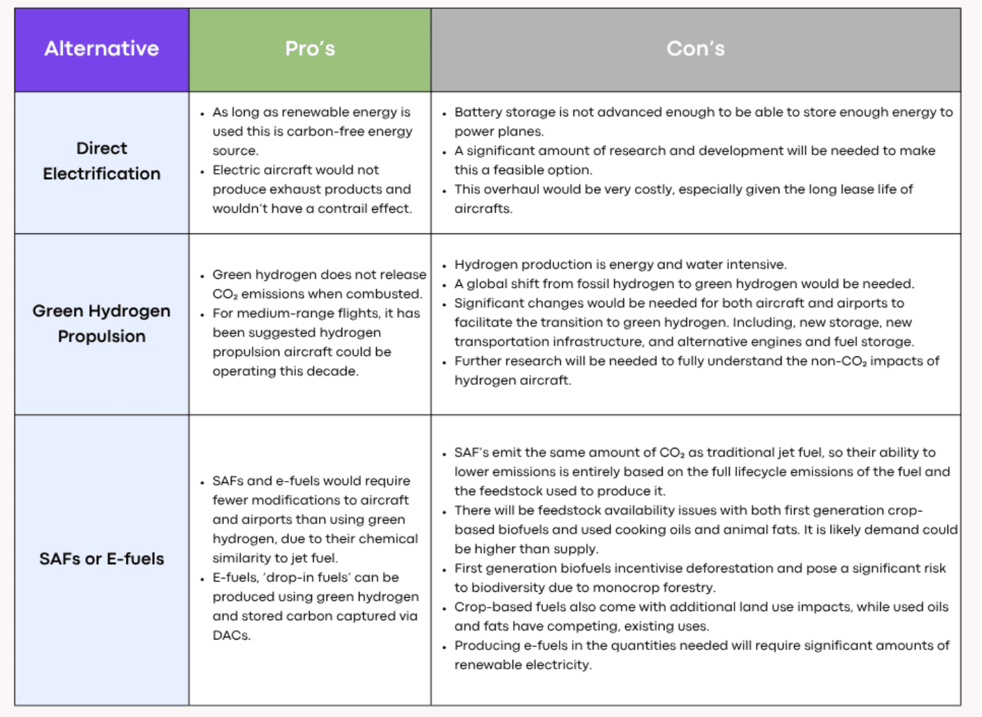 Each alternative has a range of pros and cons, showing that decarbonising aviation is incredibly complex.
