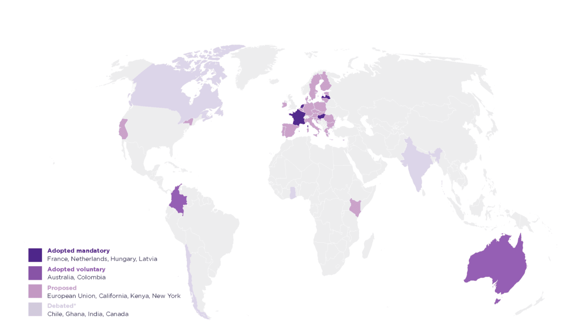 The map below outlines the status of EPR legislation for textiles globally. EU and California have since adopted a mandatory EPR structure for textiles, and the remaining countries’ status are the same.